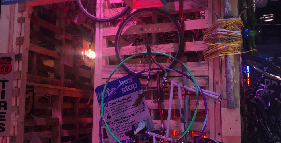 A brick doorway colored rainbow by the hues of the nearby lights welcomed me into the main room. I understood, at this point, what the Brantly immersion was all about. The panoramic view of the room encapsulated Chicago’s city life of constant chaos and diversity. The brick walls with graffiti and neon lights scattered throughout the ground made me forget, for a second, that I was in a museum and not a junkyard. Through opposing sounds from different corners and various colored lights, I felt a part of the art. While I could see the installations, I could also walk through and hear them.